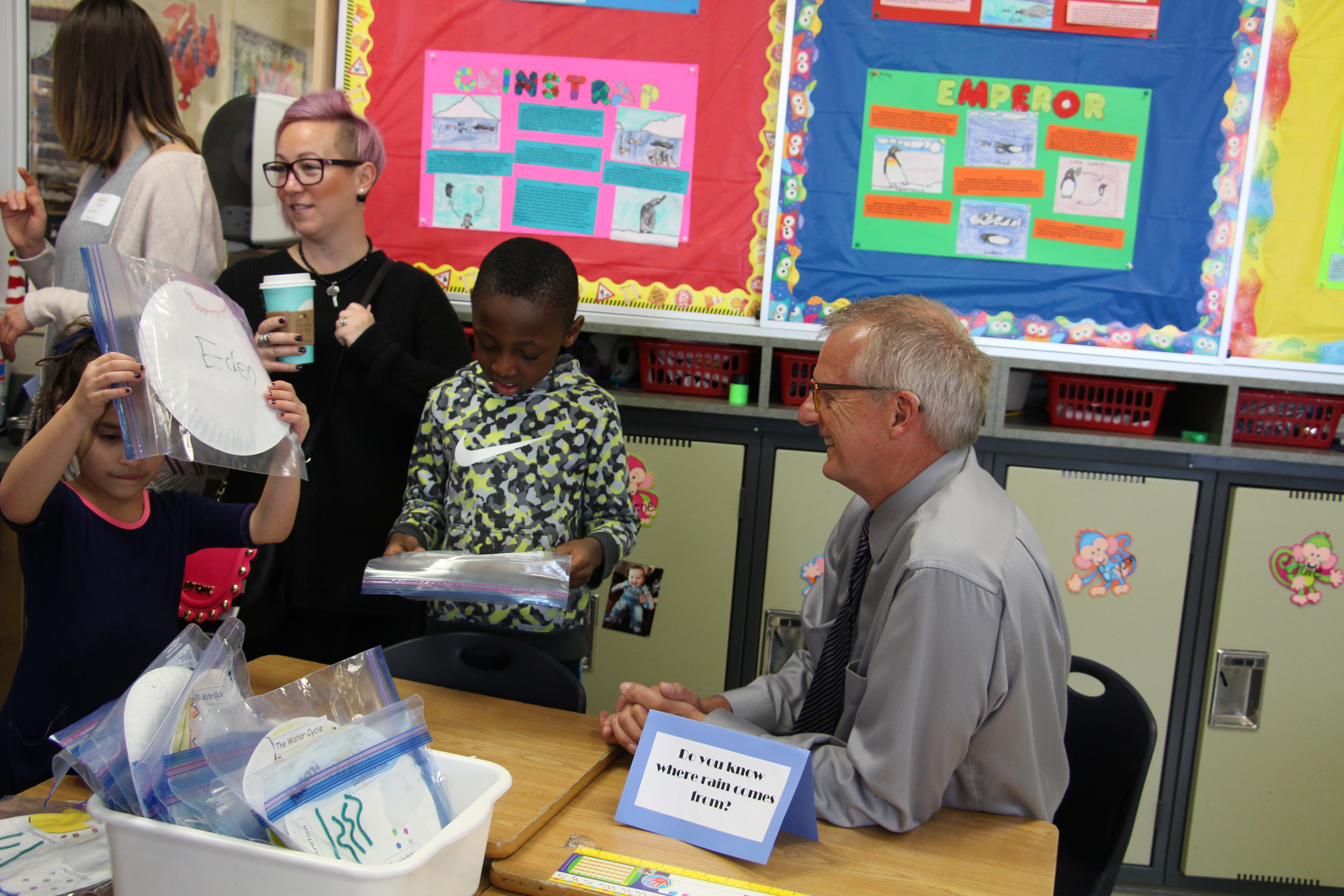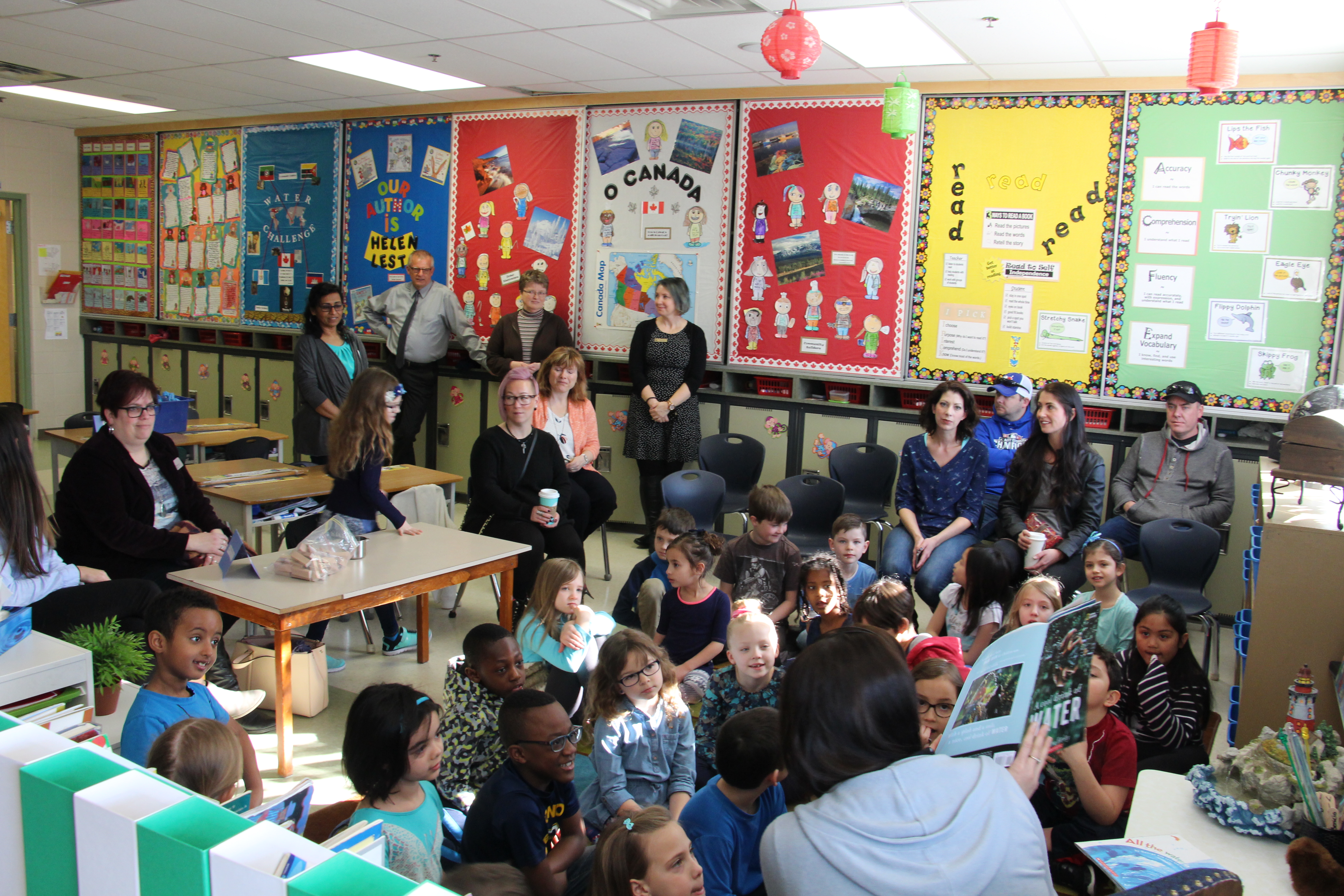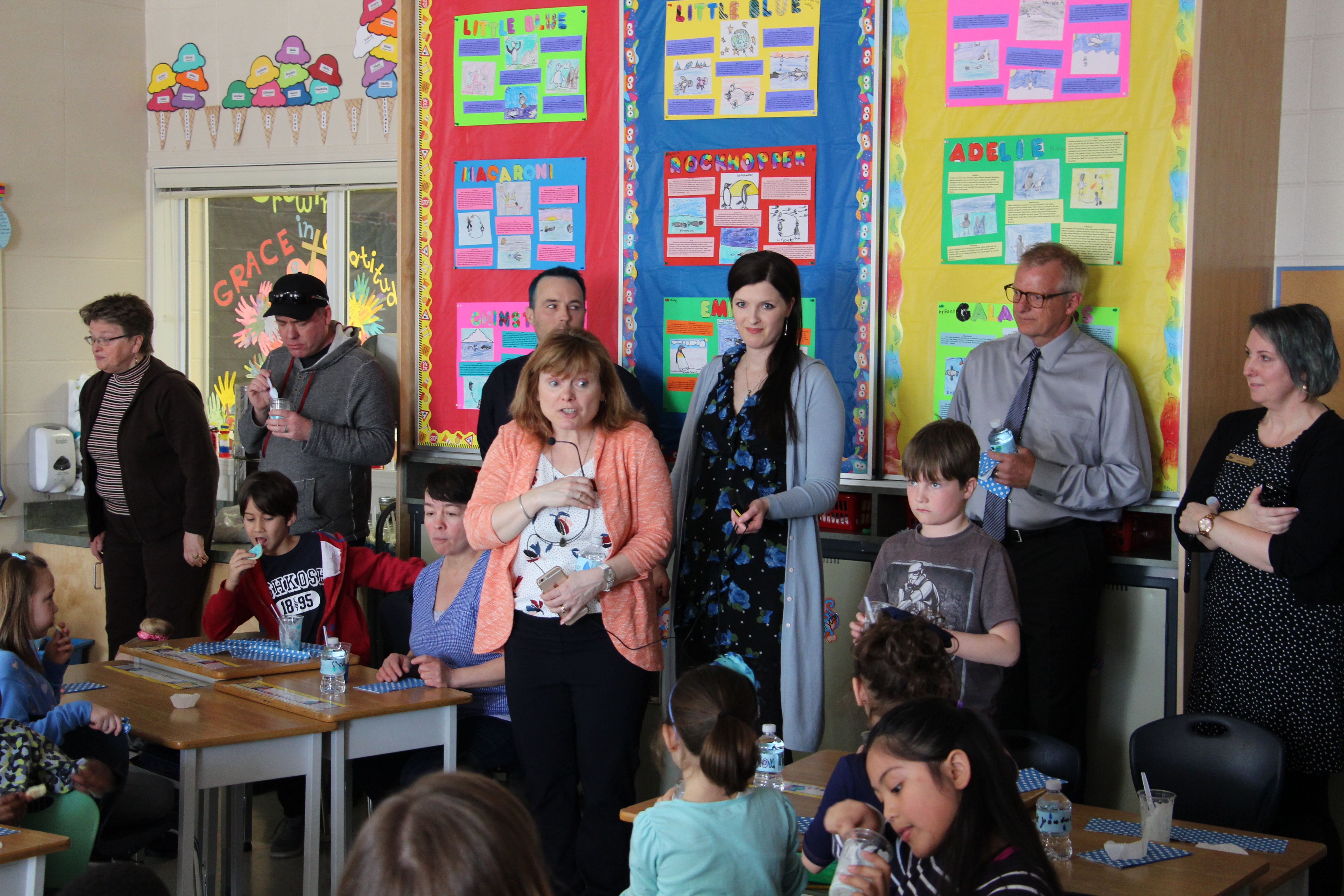 The thank you video was only one part of the celebration. Parents were there. Mr. Mike Suderman, Assistant Superintendent of Edmonton Public Schools attended, as did Mr. Peter Buisman, Executive Director of Edmonton Christian Schools. Also in attendance, Ms. Michelle Draper, Chair of Edmonton Public Schools Board of Trustees. And of course, leaders from ECNS were there, drawing some extra attention with their newly dyed blue hair which was a commitment they made to the grade two students if they reached their goals. A few pictures of the centres, songs and prayers that were part of the celebration follow: (slide show-may take a few moments to load on your device)