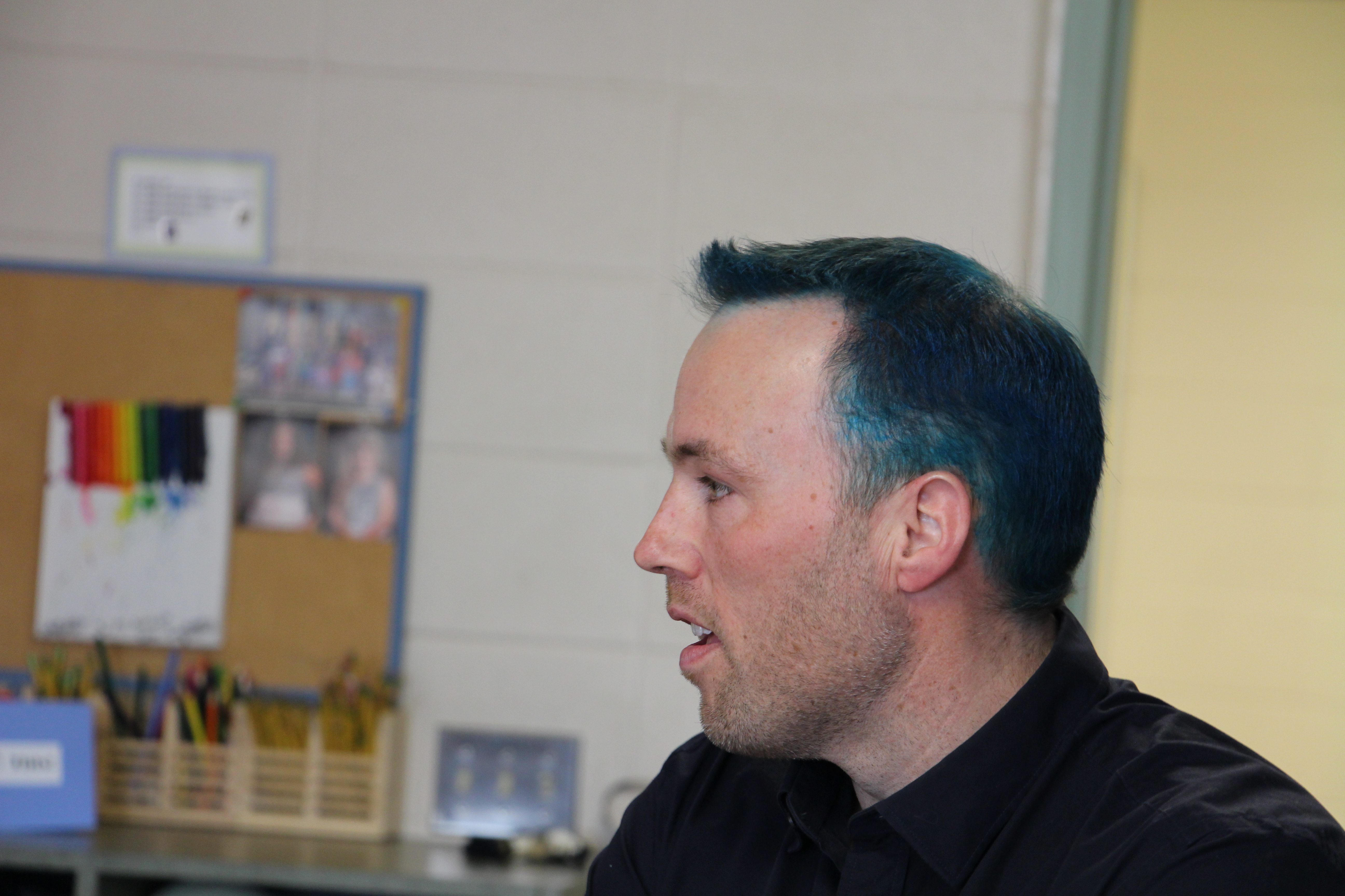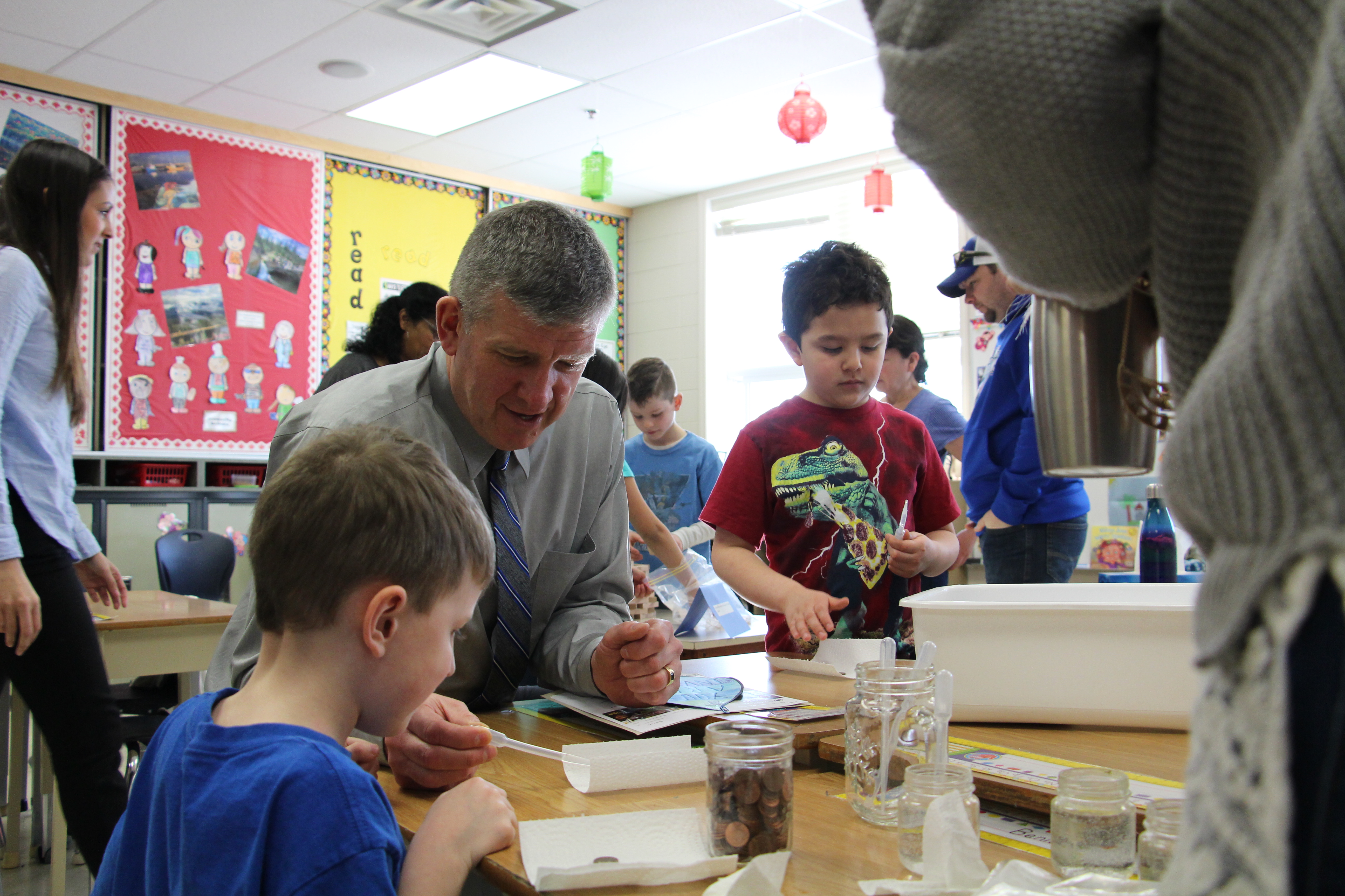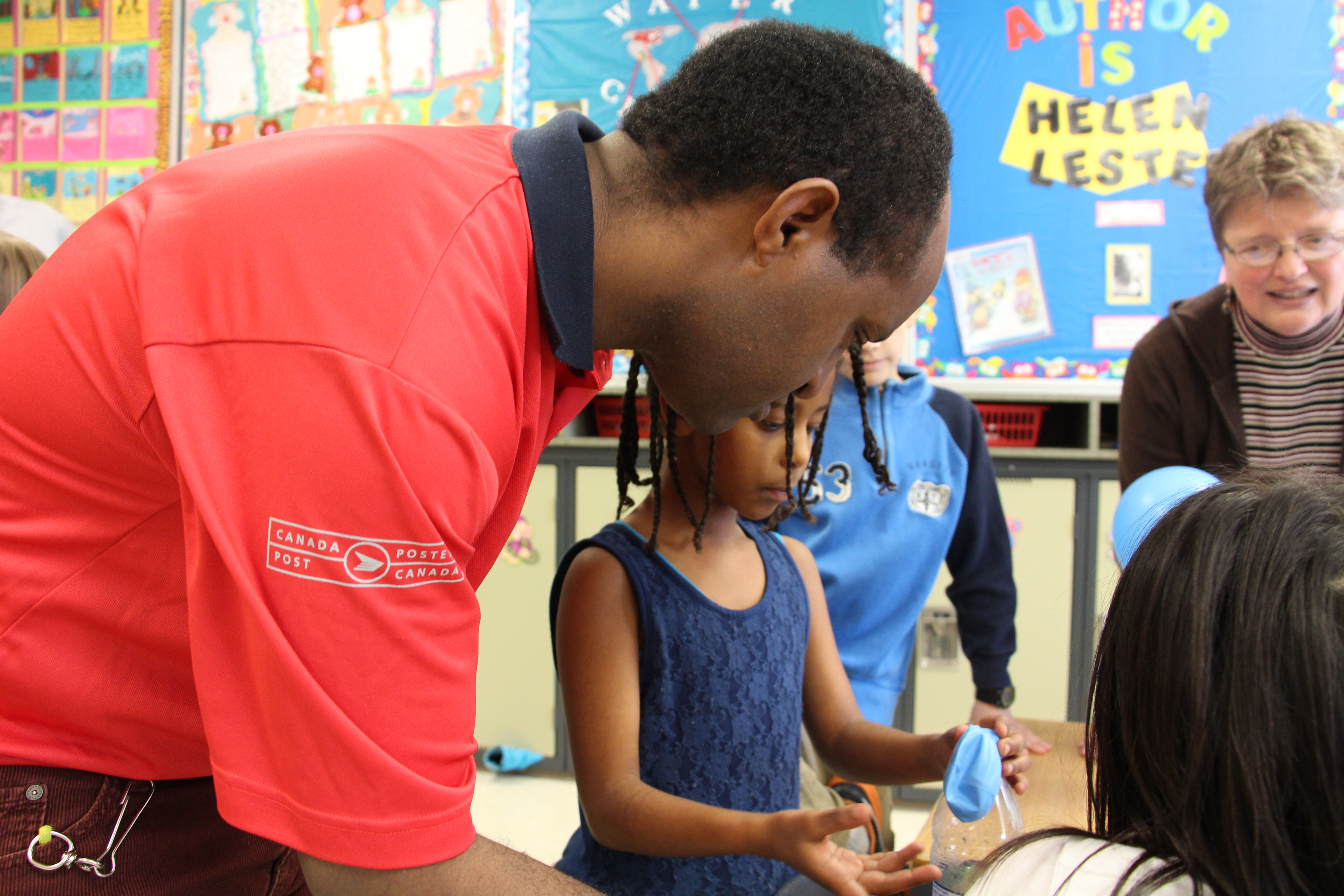 The thank you video was only one part of the celebration. Parents were there. Mr. Mike Suderman, Assistant Superintendent of Edmonton Public Schools attended, as did Mr. Peter Buisman, Executive Director of Edmonton Christian Schools. Also in attendance, Ms. Michelle Draper, Chair of Edmonton Public Schools Board of Trustees. And of course, leaders from ECNS were there, drawing some extra attention with their newly dyed blue hair which was a commitment they made to the grade two students if they reached their goals. A few pictures of the centres, songs and prayers that were part of the celebration follow: (slide show-may take a few moments to load on your device)