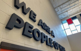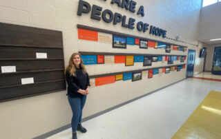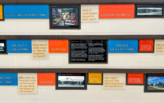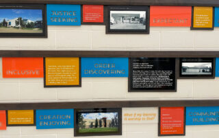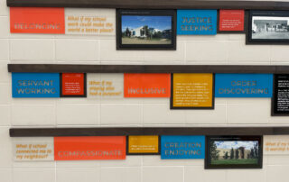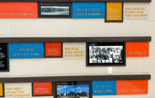 The Society has invested in creating this installation as a visual retelling of our treasured past, blessed present, and desired future. The design was developed with local artist and ECS alumni, Marina Hulzenga, and with input from Society staff, Suzanne Knol, and a few parents. Marina has a professional background in exhibit and spatial design and we feel she really helped bring the vision and mission of ECS to life in this new Story Wall.